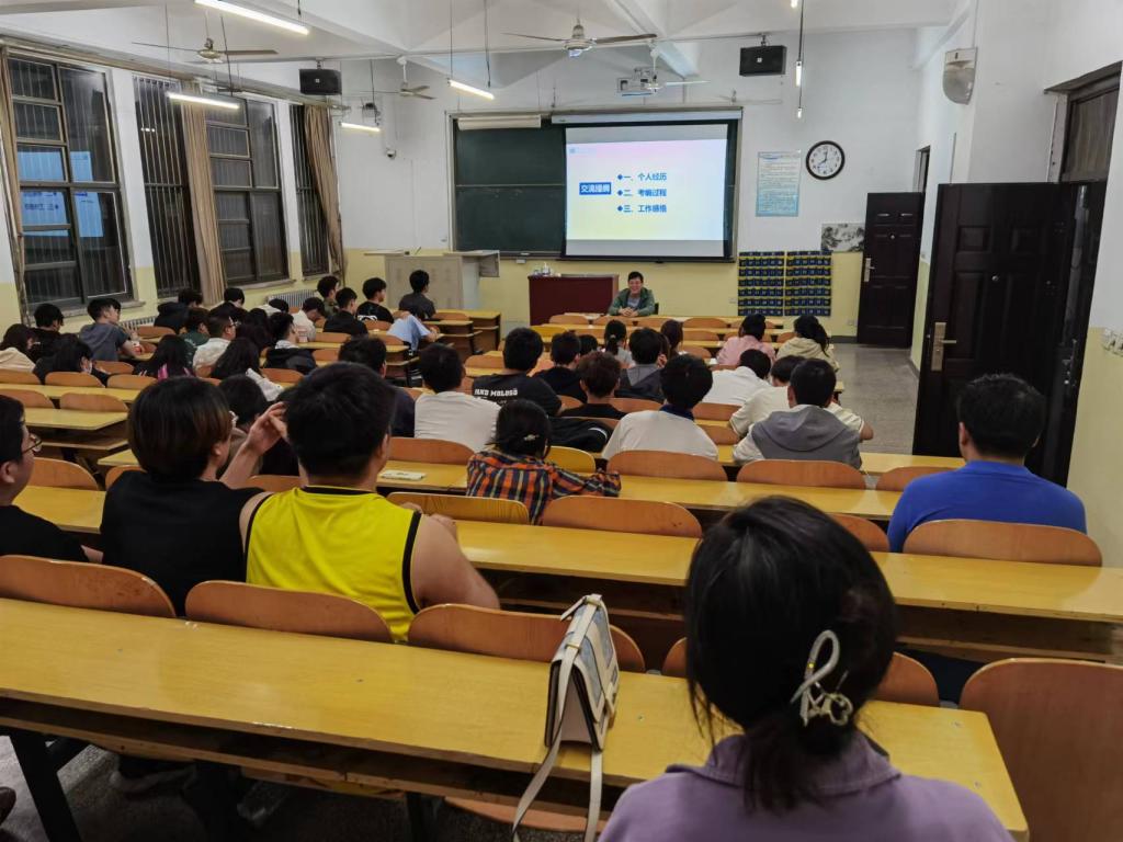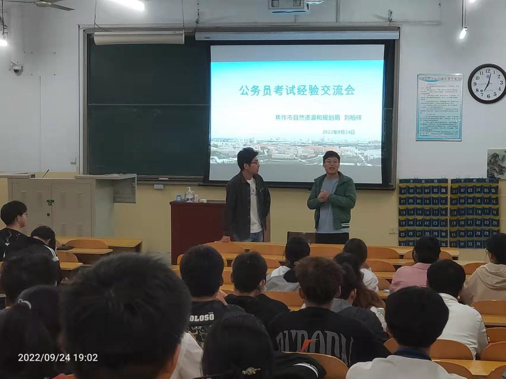 102教室召开班会暨公务员考试经验交流会。会议邀请了我校2015届毕业生、现焦作市自然资源和规划局四级主任科员刘柏祥,分享自己十余年的学习工作经历。