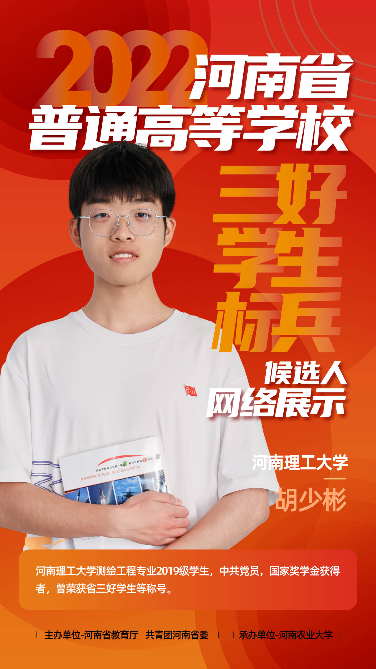 测绘工程1906班胡少彬同学入围河南省首届“三好学生标兵”。
