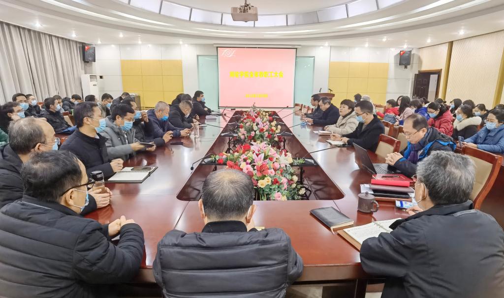 在一楼会议室召开全体教职工大会,会议由院党委书记茹艳主持。