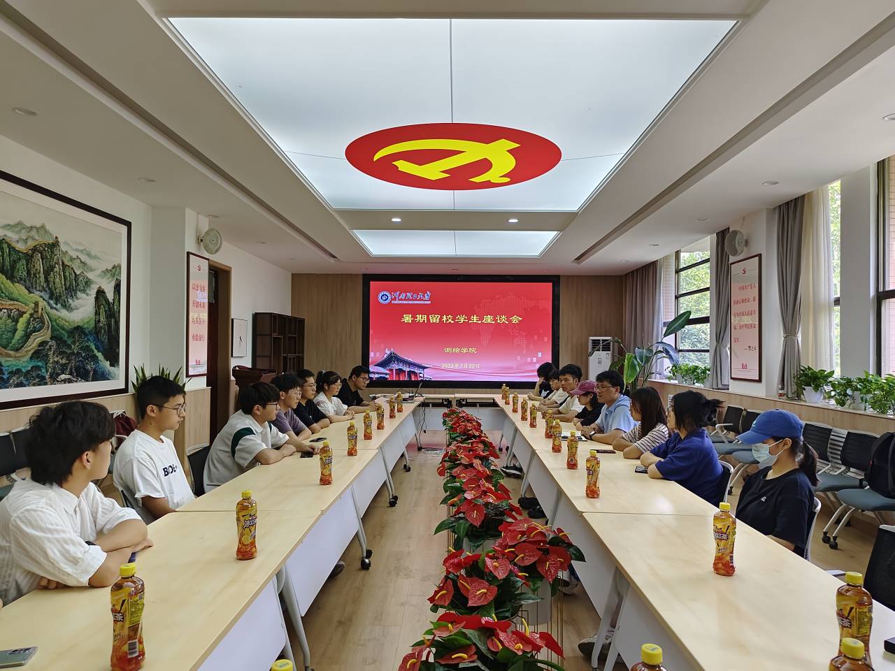 在二楼会议室召开暑期留校学生座谈会,参加座谈会的有留校学生代表和暑期临时党支部党员代表,会议由学工办主任丰习才主持。