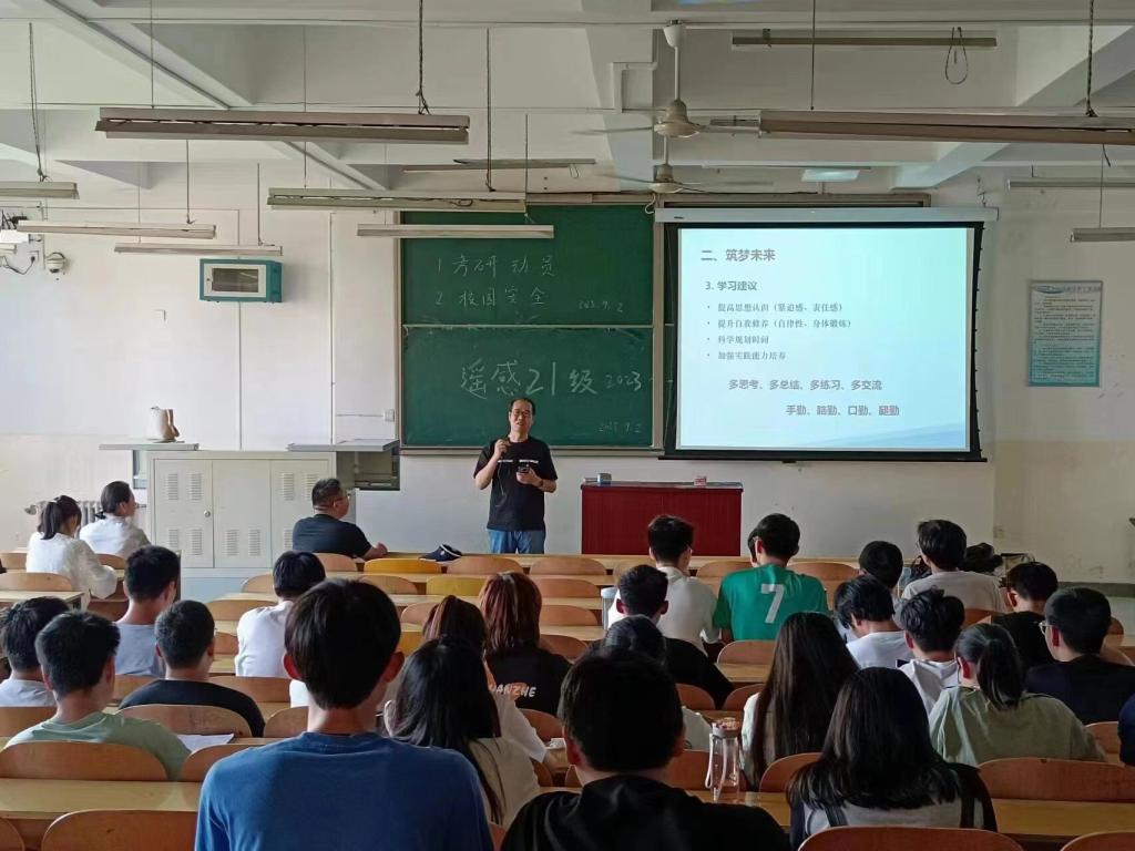 301教室举行遥感科学与技术专业21级学生开学第一课暨考研动员会,21级辅导员拓海燕、遥感专业班主任成晓倩和赵宗泽、学业导师马超和赵慧老师参加。