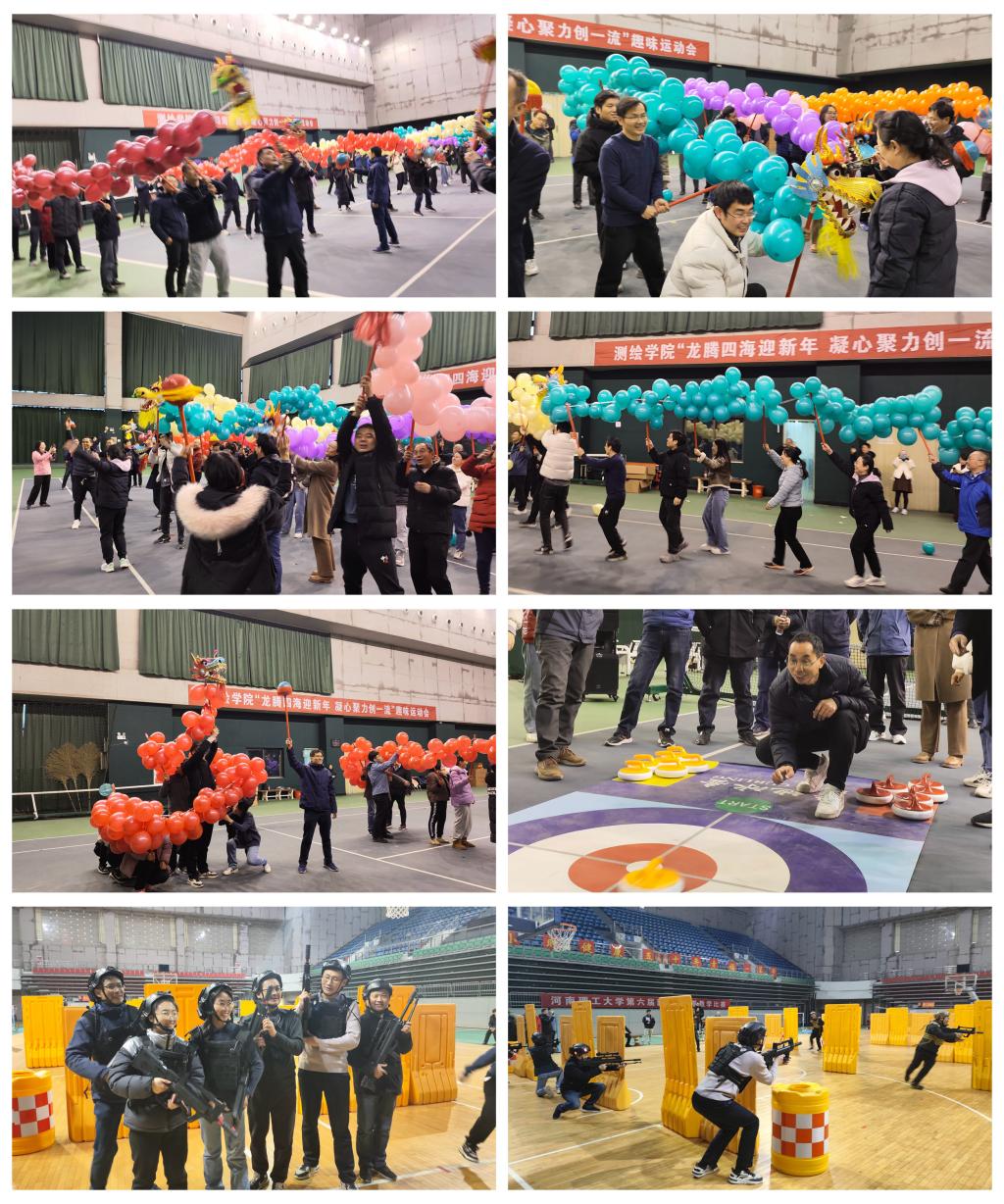 全体教职工齐聚一堂,分为八个小组,各小组凝心聚力,协同并进,共襄盛举,展现了极高的团队和竞技精神。此次趣味运动会共举办三个活动:活动一“龙腾盛世”,教职工们以小组为单位,共同完成组龙、画龙、训龙、舞龙一系列趣味挑战,展现团队协作的力量;活动二“旱地冰壶”,教职工们在模拟冰壶比赛中体验冰雪运动的魅力,锻炼战略思维和协调能力;活动三“战火青春”,教职工们通过真人CS拓展训练,提升心理素质,凝聚团队精神。活动现场,笑声和欢呼声此起彼伏。教职工们通过一系列有趣的活动,不仅锻炼了身体,增进了友谊,还感受到了运动的快乐和团结的力量。