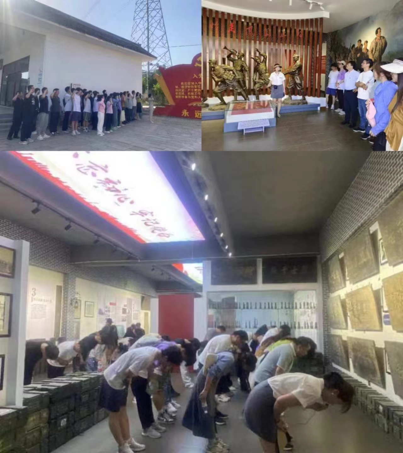 师生走进典礼学书文化展览馆。修德养廉教育馆内的弹药箱、石地雷、红色历史碑刻、老照片、书信等历史印记,记录着一段段红色故事,让大家重温了那个战火纷纷的年代。在匾额区前,讲解员介绍了墙上一块块由当地政府部门颁发给在抗日战争、解放战争中牺牲的烈士家属的匾额——“烈士千秋”“烈昭千古”“为民立功”等,其中最小的烈士只有14岁,听到这里,大家都心情沉重,在讲解员的引导下,在牌匾前满含敬意深深鞠躬。是他们坚定的理想信念,铸就了历史的辉煌,成就了我们今天这个伟大时代。大家纷纷表示要踏着他们的足迹,不忘初心,勇毅前行。