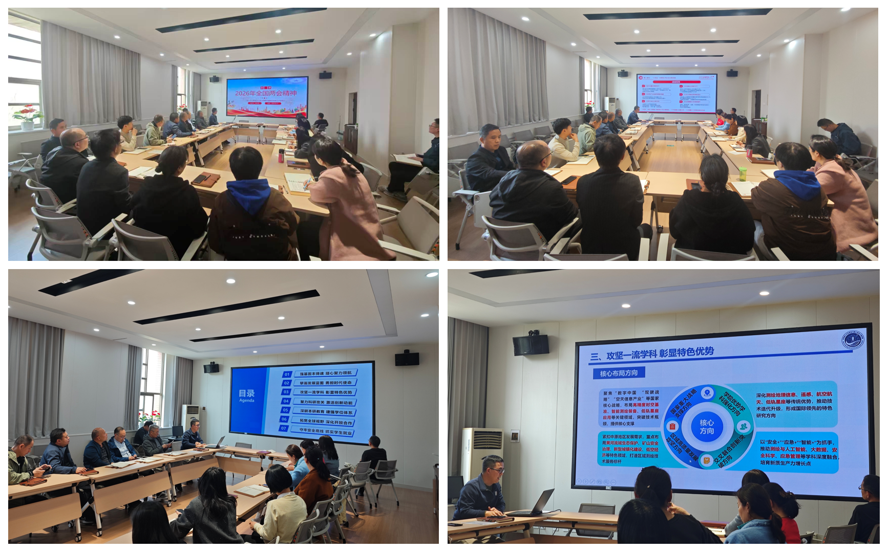 袁占良首先带领大家深入学习了2026年全国两会精神。他指出,2025年国家在复杂形势中在经济发展、科技创新、民生保障等多领域成绩斐然。“十四五”时期,国家在经济结构优化、创新能力提升等方面取得历史性突破,为“十五五”发展积累经验、创造条件。“十五五”时期,国家聚焦高质量发展,推动科技创新与产业升级深度融合,地信专业作为战略性新兴产业重要支撑,机遇与挑战并存,老师们要紧跟国家战略,加强学科建设与人才培养,为国家发展贡献专业力量。