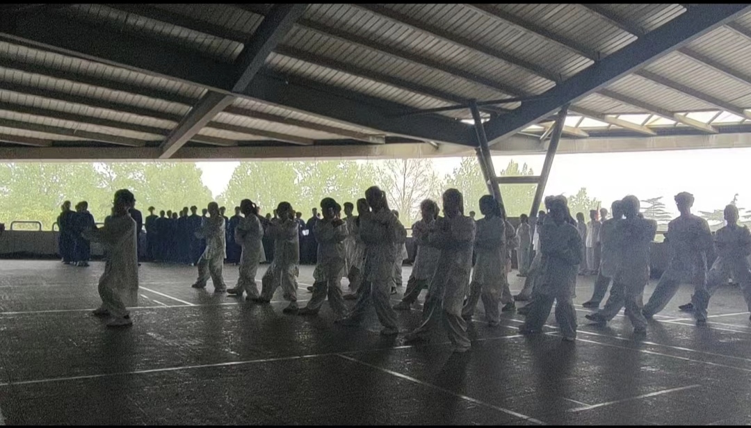 武术代表队选择南拳和太极拳进行演绎。训练期间,教练、工作人员及参赛运动员们日日训练,不畏困难,认真学习各项武术动作,为在赛场上的出色表演奠定了基础。赛场上,伴着悠扬的旋律,南拳方阵的队员们动作准确流畅,力量与美感并存,充分展现了南拳的独特魅力。太极拳方阵的队员们以整齐划一的动作,流畅自如的步伐,展示了太极拳的独特魅力。他们的每一招每一式都凝聚着力量与柔美,充分展现了太极的精髓——刚柔相济、动静结合。队员们在场上的精彩表现赢得了观众和评委们的阵阵掌声。