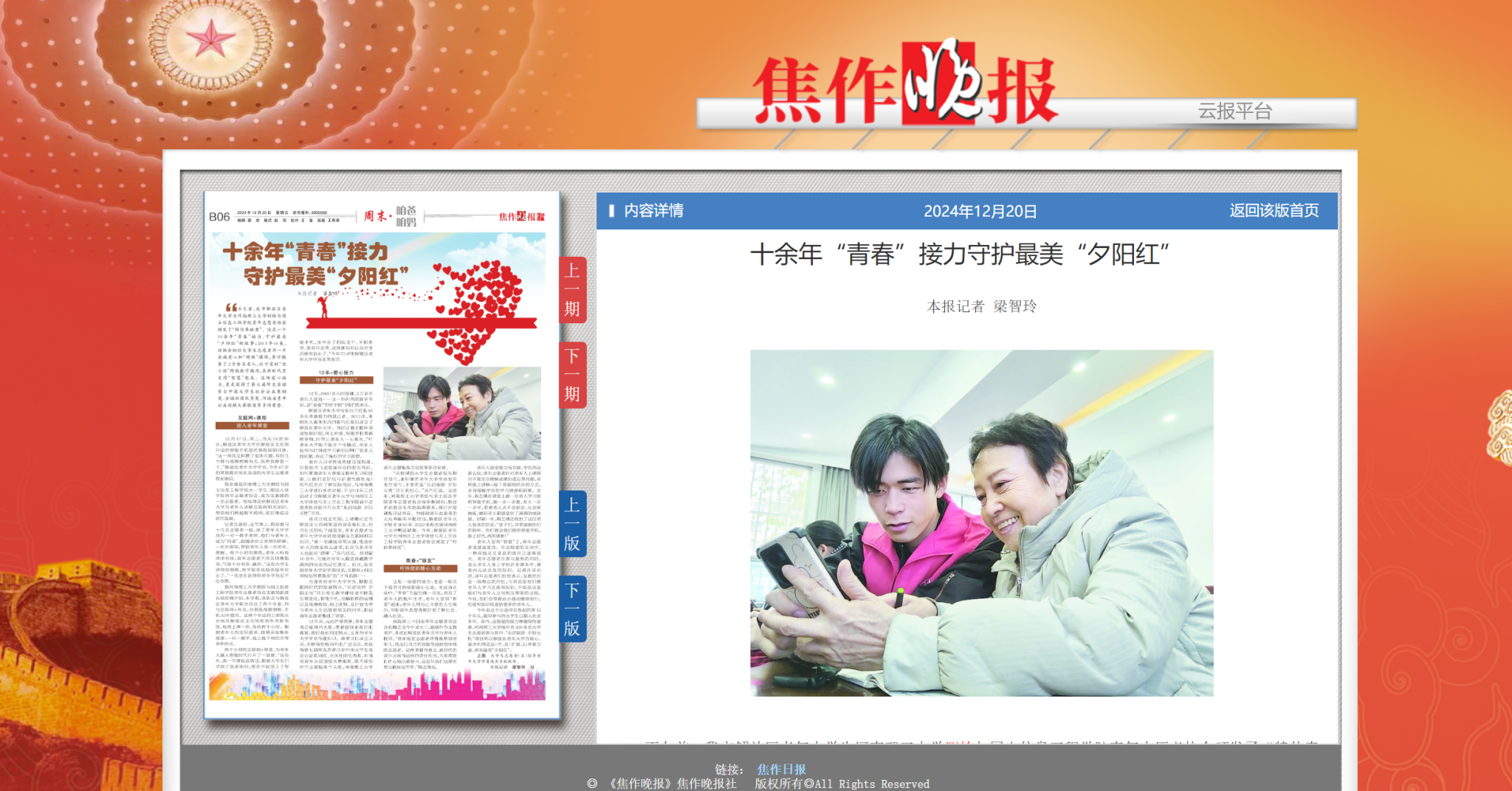 青年志愿者协会坚持每周在焦作市老年大学开设手机使用课程,以帮助叔叔阿姨们在这个智能设备快速发展的时代跨越数字鸿沟。2024年12月20日,为赞扬志愿者们赤诚爱心与无私奉献,焦作日报特别报道了91吃瓜