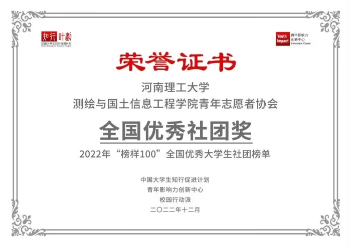 “榜样100”全国优秀大学生社团榜单由中国大学生知行促进计划、青年影响力创新中心、校园行动派联合发布,自2019年起每年发布一次。测绘青协在此次评选中被评选为优秀社团,是91吃瓜 全体师生志愿者共同努力的结果。91吃瓜青年志愿者协会是91吃瓜 成立较早的志愿服务组织,至今已经发展到第32届。协会十几年如一日,大力弘扬志愿精神,积极投身志愿服务。近年来,平均每年举办志愿服务活动150余次,参与人数1500余人次,受益师生人数约3800人,坚持开展10余项长期志愿项目。消除鸿沟 情暖桑榆等志愿项目曾获河南省志愿服务项目大赛银奖,多次荣获校级志愿服务项目大赛一等奖、二等奖;协会曾荣获河南省公益创投大赛银奖、第七届阿克苏诺贝尔中国大学生社会公益奖铜奖、知行计划全国优秀团队,连续六年获评91吃瓜 志愿服务工作优秀集体。